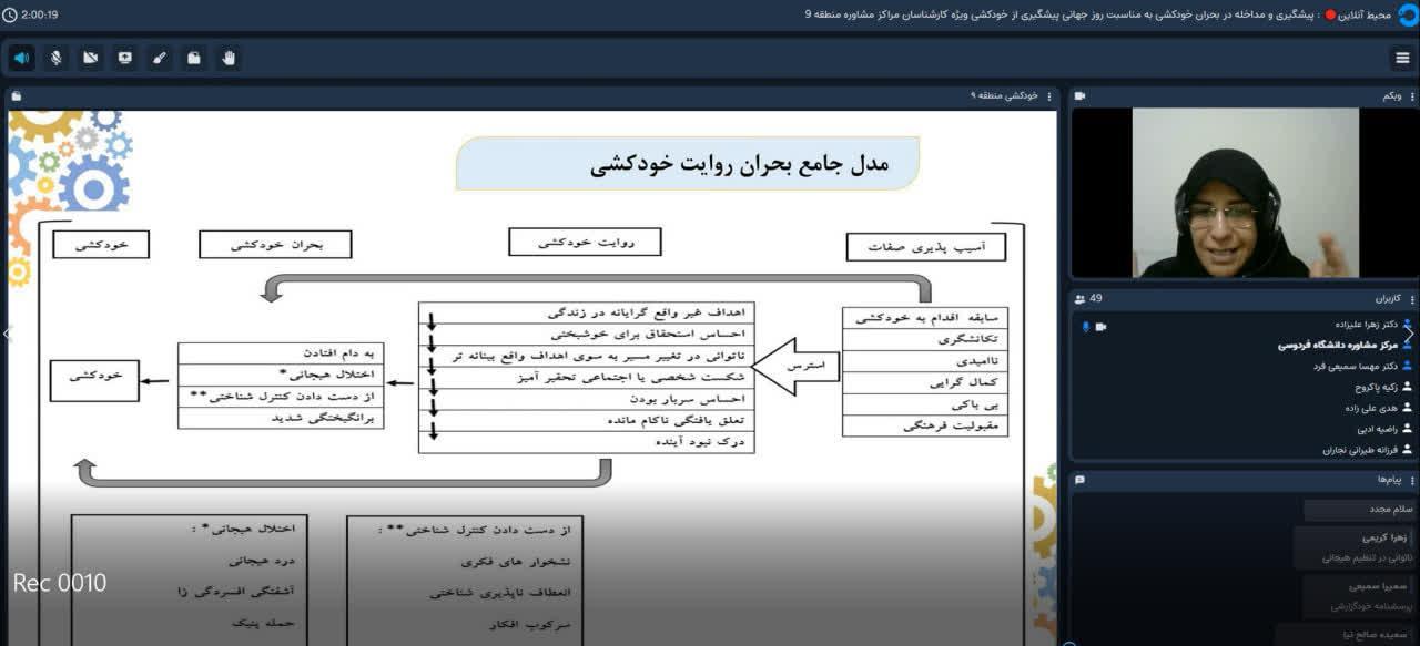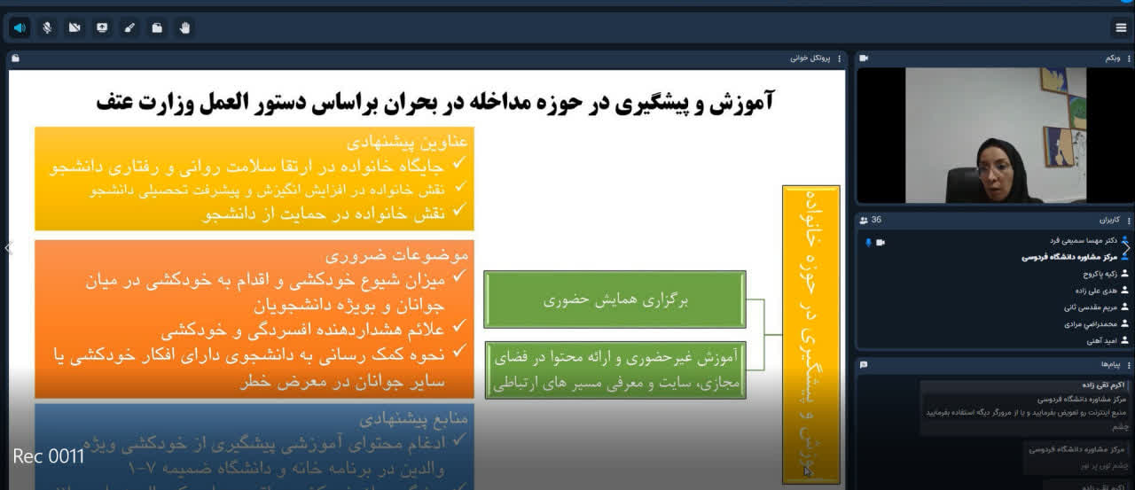 🔹کارگاه تخصصی پیشگیری و مداخله در بحران خودکشی با تدریس سرکار خانم دکتر زهرا علیزاده (روانشناس بالینی و عضو هیأت علمی دانشگاه امام رضا (ع)) و سرکار خانم دکتر مهسا سمیعی فرد (معاونت و مسئول مداخله در بحران مرکز مشاوره دانشگاه فردوسی)، ویژه کارشناسان، مشاوران و روانشناسان مراکز مشاوره دانشگاه های منطقه ۹ کشور در تاریخ ۸ مهر ماه ۱۴۰۴ به مدت ۴ ساعت به صورت مجازی در فضای محیط آنلاین مرکز مشاوره و سبک زندگی دانشگاه فردوسی برگزار شد.